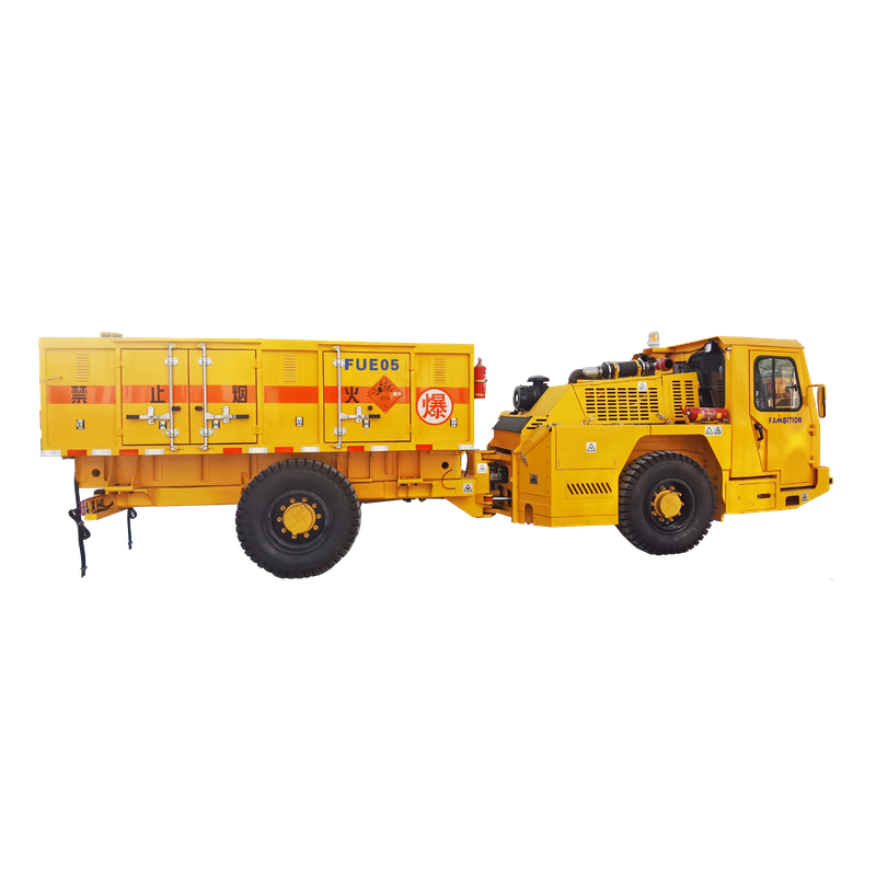 El FUE05 es un vehículo de transporte de explosivos sin orugas con una capacidad de carga máxima de 5 toneladas. Este modelo cuenta con componentes de alta calidad que cumplen con los estándares internacionales, un bastidor articulado y un sistema de dirección asistida totalmente hidráulica. Su sistema de frenos utiliza frenos húmedos multidisco completamente cerrados integrados con tecnología SAHR, mientras que la potencia es suministrada por un motor turboalimentado Cummins de bajas emisiones que cumple con los estándares de emisiones National IV. La cabina del operador tiene certificación FOPS/ROPS y está equipada con una pantalla multifuncional incorporada que permite monitorear en tiempo real el estado del equipo y brinda soporte para la resolución de problemas.